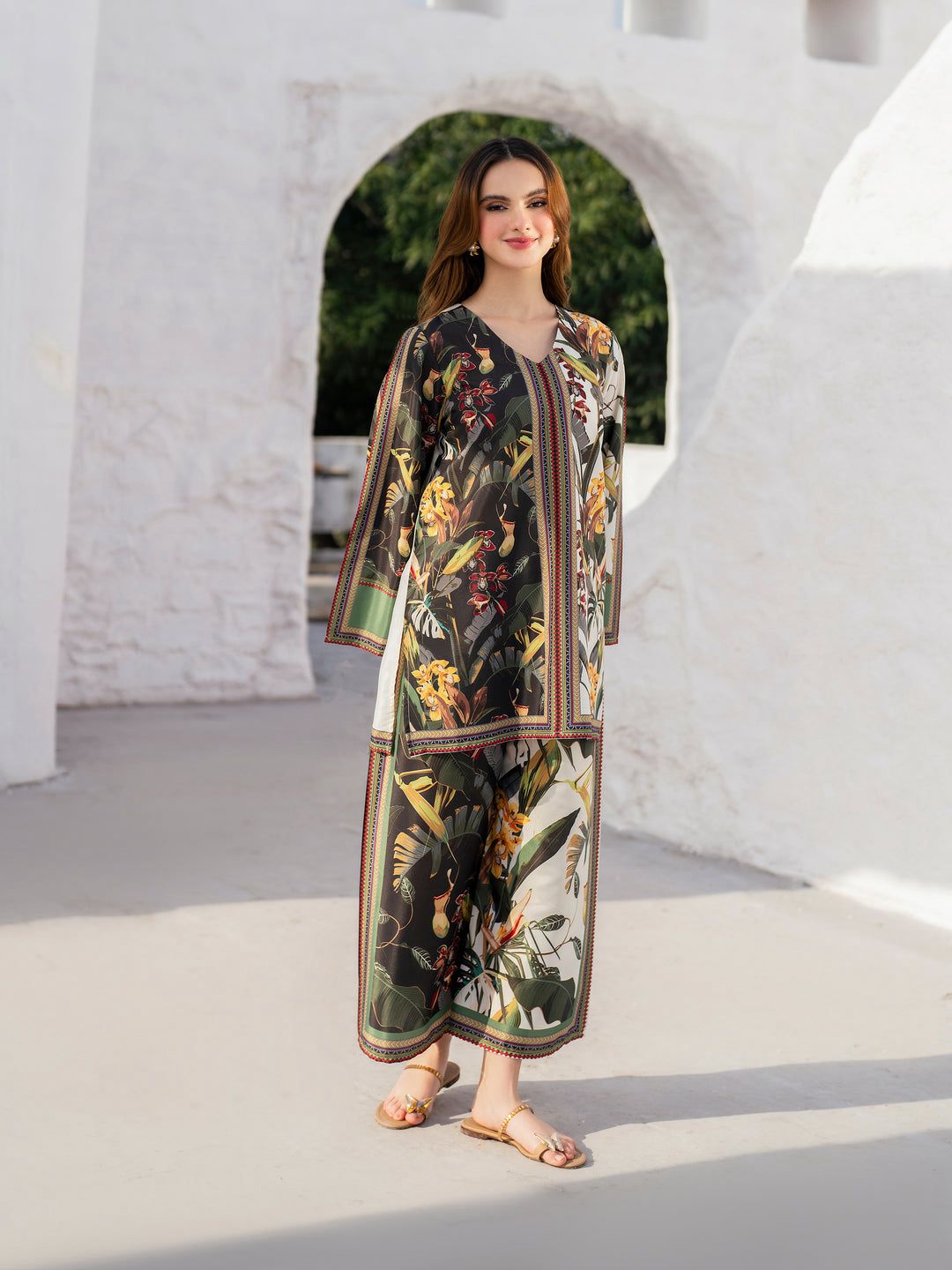 Step into elegance with this beautifully designed two-piece outfit. Featuring a dark base adorned with tropical floral prints, this suit blends earthy tones with vibrant patterns for a chic and graceful look. Perfect for casual outings, gatherings, or day events.